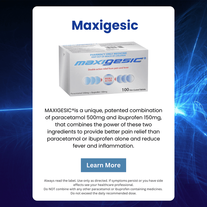 Maxigesic’s unique combination of paracetamol to reduce the pain and ibuprofen to reduce inflammation provides effective “double-action” pain relief for headaches and migraines, toothache, muscular pain, arthritis or rheumatic pain and backache and period pain.
